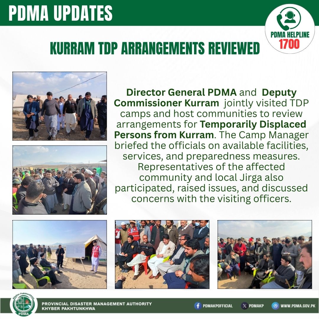 Director General PDMA and Deputy Commissioner Kurram jointly visited TDP camps and host communities on January 19, 2026, to review arrangements for Temporarily Displaced Persons from Kurram. The Camp Manager briefed the officials on available facilities, services, and preparedness measures. Representatives of the affected community and local Jirga also participated, raised issues, and discussed concerns with the visiting officers.
